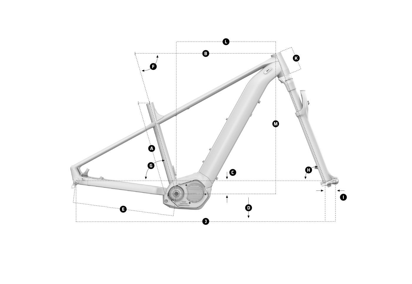 Frame size XS S M L XL A Longitud tubo sillín 380mm 390mm 430mm 470mm 658mm B Longitud tubo superior 600mm 615mm 645mm 670mm 700mm C Caída eje pedalier 60mm -60mm -60mm -60mm -60mm D Altura eje pedalier 317mm 317mm 317mm 317mm 317mm E Longitud vainas 455mm 455mm 455mm 455mm 455mm F Ángulo tubo sillín real 73.5º 73.5º 73.5º 73.5º 73.5º G Ángulo tubo sillín efectivo 73.5º 73.5º 73.5º 73.5º 73.5º H Ángulo dirección 69º 69º 69º 69º 69º I Fork Offset 51mm 51mm 51mm 51mm 51mm J Distancia entre ejes 1138mm 51mm 1183mm 1210mm 1240mm K Longitud pipa 110mm 110mm 110mm 130mm 130mm L Reach 410mm 425mm 455mm 480mm 505mm M Stack 640mm 640mm 640mm 658mm 658mm